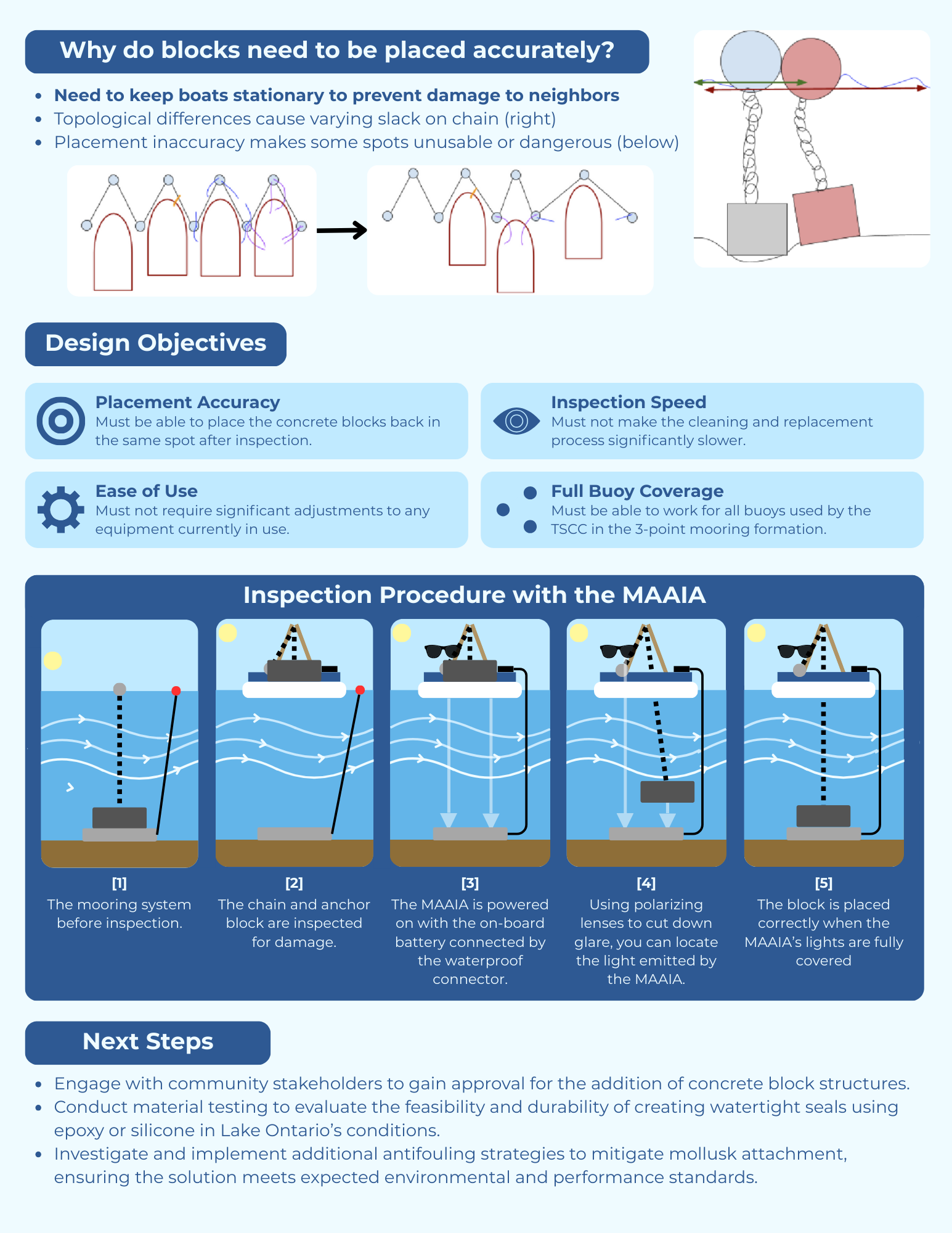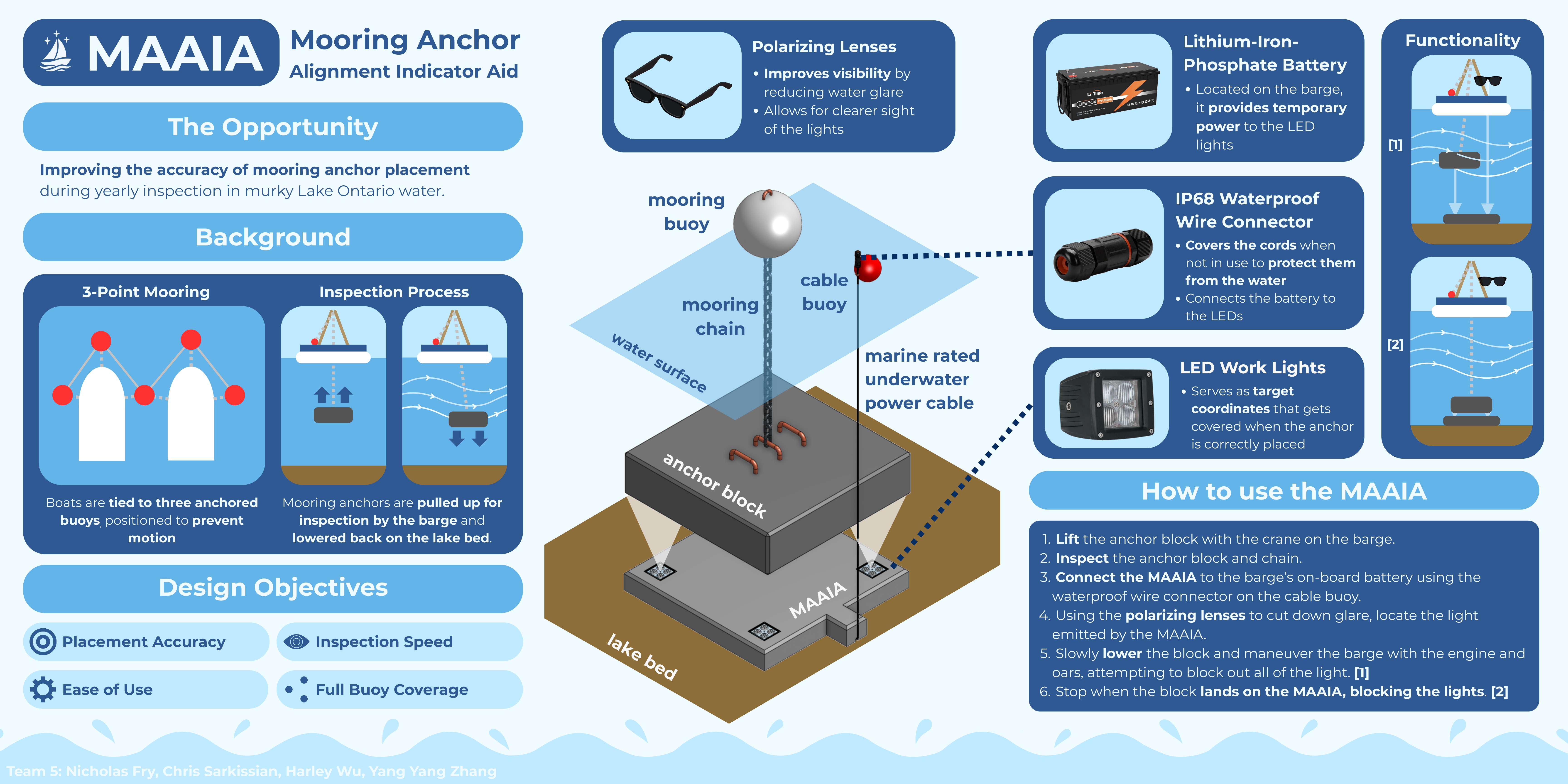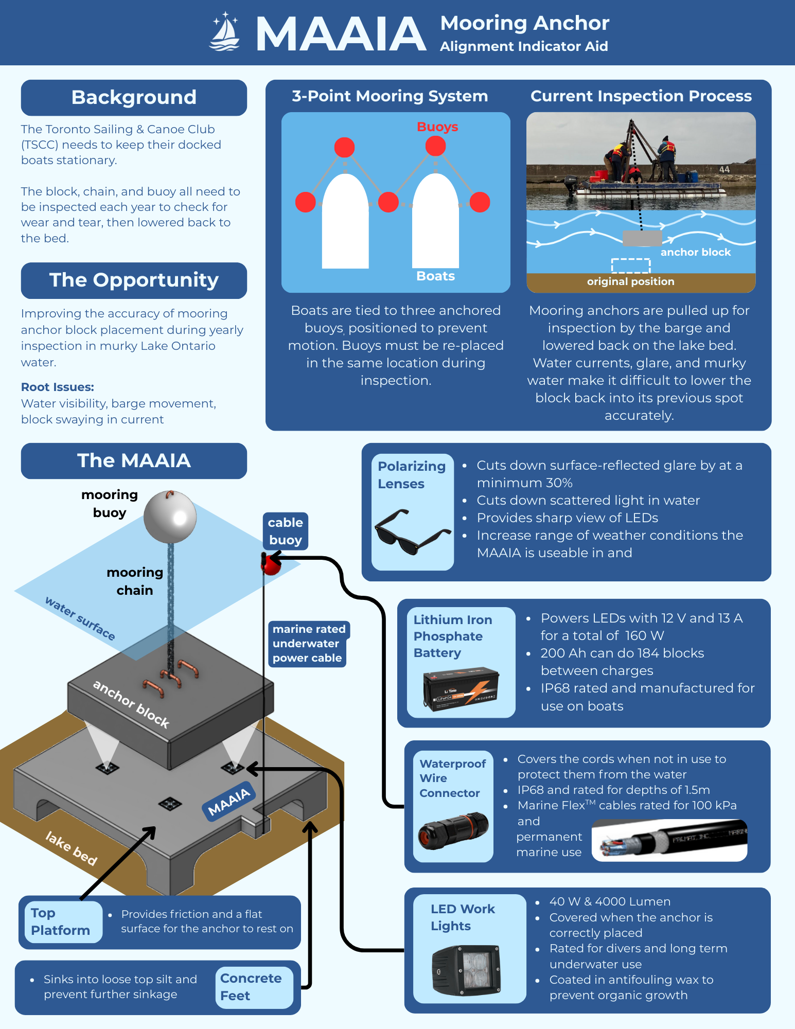 Every year, the Toronto Sailing & Canoe Club has to pull up their mooring anchor blocks from Lake Ontario for inspection, then lower them back down to the exact same spot. The problem? Lake Ontario is murky, currents push the block around on the way down, and surface glare makes it nearly impossible to see what's happening underwater. Miss the spot, and boats don't stay stationary — which means damage to neighboring boats.